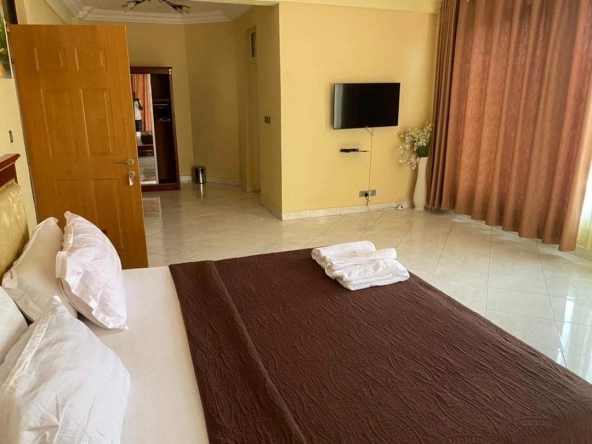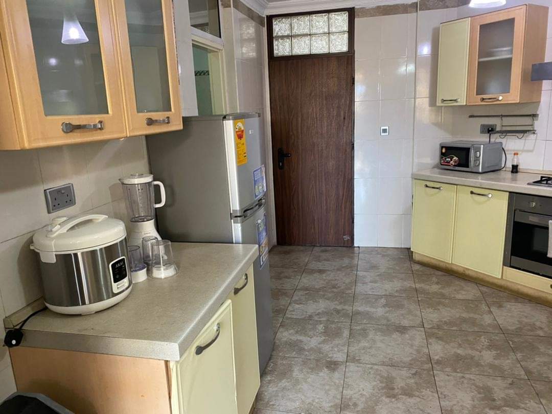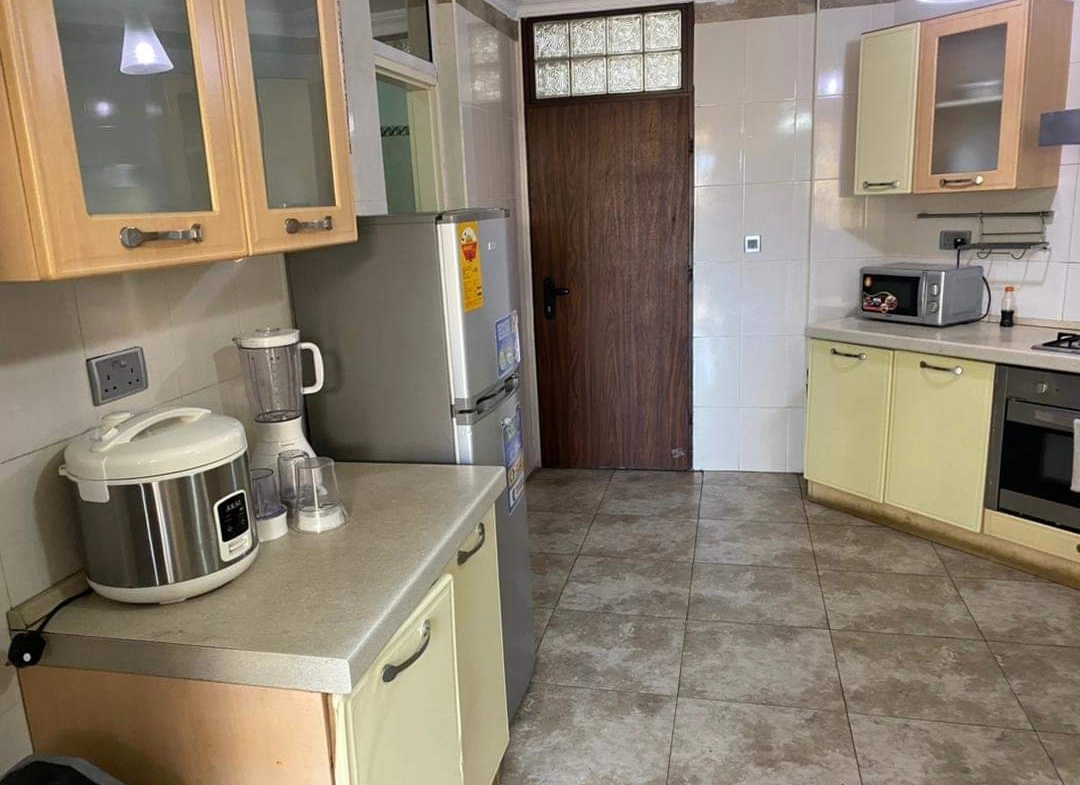 - Fully Equipped Kitchen: The modern kitchen comes fully equipped with essential appliances, including a refrigerator, stove, microwave, and oven. It also features ample cabinet space, a pantry, and a dining area with a table and chairs, making it perfect for preparing and enjoying meals.